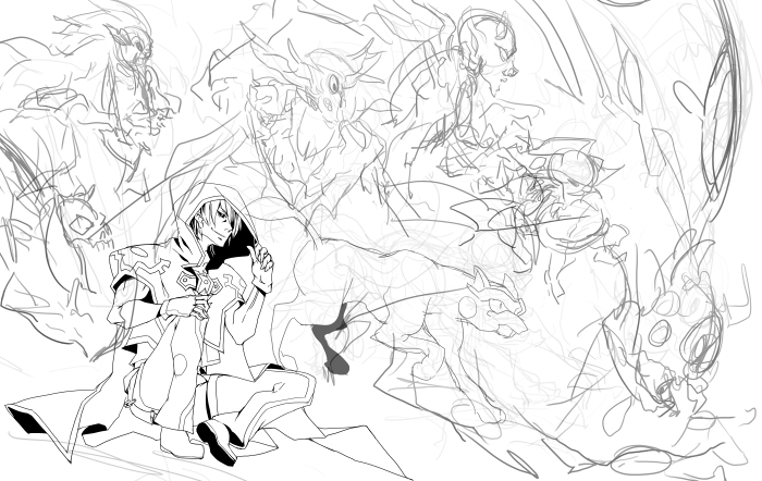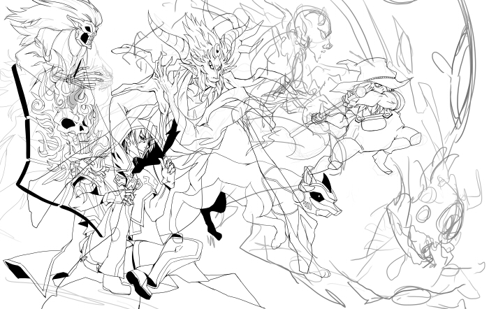 なんか面倒くさい→描きかけの鬼柳さんでいいや→寂しいから百目足そう→どうせならインフェルニティも足そう→こうなったらアプたんも忘れられない→何この地獄の一丁目