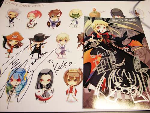 ギルティギアの創造神、石渡様とブレイブルーの創造神、森様のサイン会にそれ持って行ったアホ(待て)が居たみたいで、それを探して彼らの知り合いがウチのテーブルに来て下さいました。
