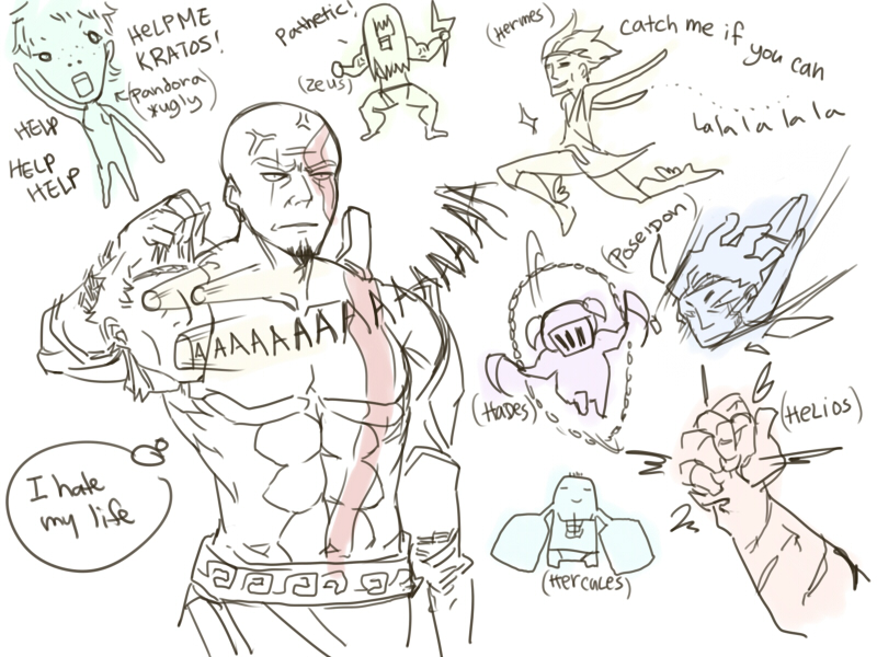クレイトス:主人公。ハゲマッチョで容赦しない。神に振り回されて不幸になったので復讐に燃えている。その復讐の過程で自然を司る神々をぶっ殺しているので世界が天変地異だらけで終了気味になってしまう。でも復讐のためだから致し方なし。