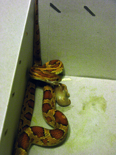 普通は丸呑みするのでグロくならないのですが、たまに子ネズミが元からボロボロだったりすると途中でもげたりして中から色々出てきたりします。