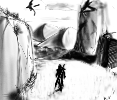 今日最初の絵。体調悪くていつも描いてる感じの絵が嫌になったから、記憶からモンハンのステージ絵を描こうとして失敗した。飛んでるのはリオレウス。